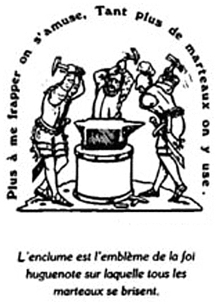 En ces temps où l’étau se resserre sur les chrétiens et où, succombant à cette pression culturelle doublée d’une persécution politique, des centaines de milliers de nos frères glissent dans l’erreur jusqu’à perdre leur salut, je pense c’est un bon moment pour nous remémorer quelques symboles de la lutte franco-protestante, en premier lieu l’enclume et la devise « TANT PLUS À ME FRAPPER ON S’AMUSE, TANT PLUS DE MARTEAUX ON Y USE ! »