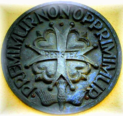 La devise « RÉSISTEZ » fut reprise par les luthériens français du Pays Messin (ville de Metz et villages voisins en Moselle), que la persécution frappa également après 1685. La plaque ci-dessous fut apposée sur la porte d’entrée d’un de leurs temples lorsqu’ils furent réouverts environ cinquante ans plus tard. Elle porte l’inscription latine « PREMIMUR NON OPPRIMIMUR » — « OPPRIMÉS MAIS PAS ABATTUS » (2 Corinthiens 4).