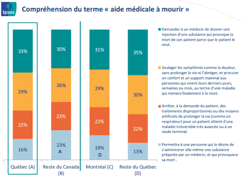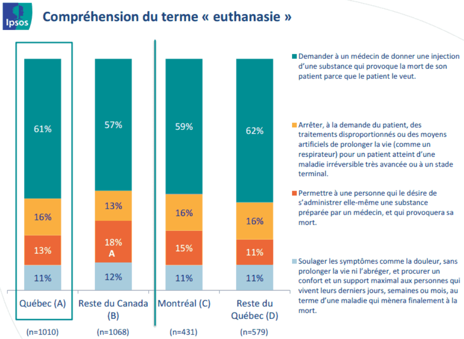 Nous voyons que 67 % des Québécois interrogés ne connaissent pas la véritable signification de l’euphémisme « aide médicale à mourir », et ne peuvent par conséquent même pas comprendre la portée concrète du Projet de loi n° 52, alors que cela les concerne très sérieusement. Par ailleurs, un autre récent sondage (mi-septembre 2013) mené auprès de 1200 médecins de la province révèle que 59 % d’entre eux refuseraient d’administrer une euthanasie.