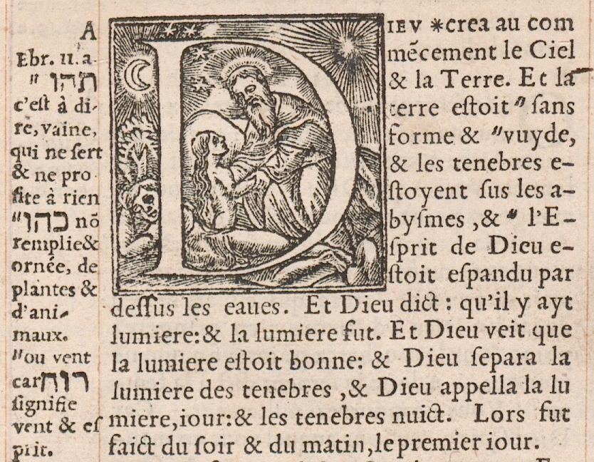 Image de Dieu le Père au début du texte de Genèse 1 dans la Bible de Genève de 1546 (révisée par Calvin !) :