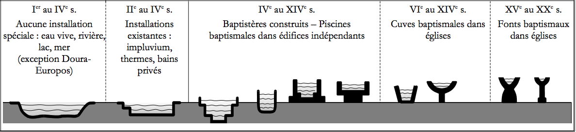Évolution historique des installations baptismales (schéma tiré de Frédéric Bühler, Le baptême : Aspects historique, archéologique et biblique, Centre de Recherche, d’Information et d’Entraide – CRIE, Mulhouse, 2002, p. 54-55) :