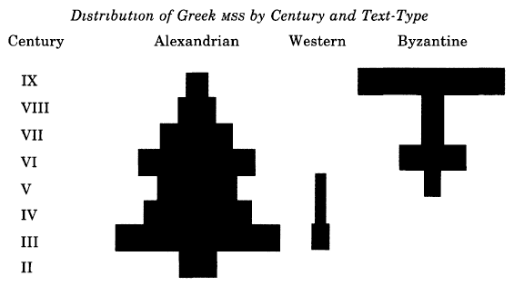 « D’accord en cela avec tous les savants travaillant dans le respect de l’histoire, les exégètes sont conscients que la qualité prime la quantité. […] L’enjeu, c’est d’établir quel degré de proximité on peut reconnaître aux sources par rapport à la vérité qui nous intéresse, c’est-à-dire par rapport au libellé original. Ce qui est décisif à cet égard, c’est non seulement la proximité dans le temps, mais aussi du point de vue du contenu. […] [L]e texte alexandrin peut clairement revendiquer une plus grande proximité de l’original que le byzantin. Autrement dit, malgré une majorité de sources qui l’attestent [≈ 85 % des manuscrits au total], le texte byzantin doit être qualifié de moins bon de par sa proximité de l’original vue sous l’angle de la chronologie et du contenu. » (Heinrich von Siebenthal, loc. cit., p. 232).