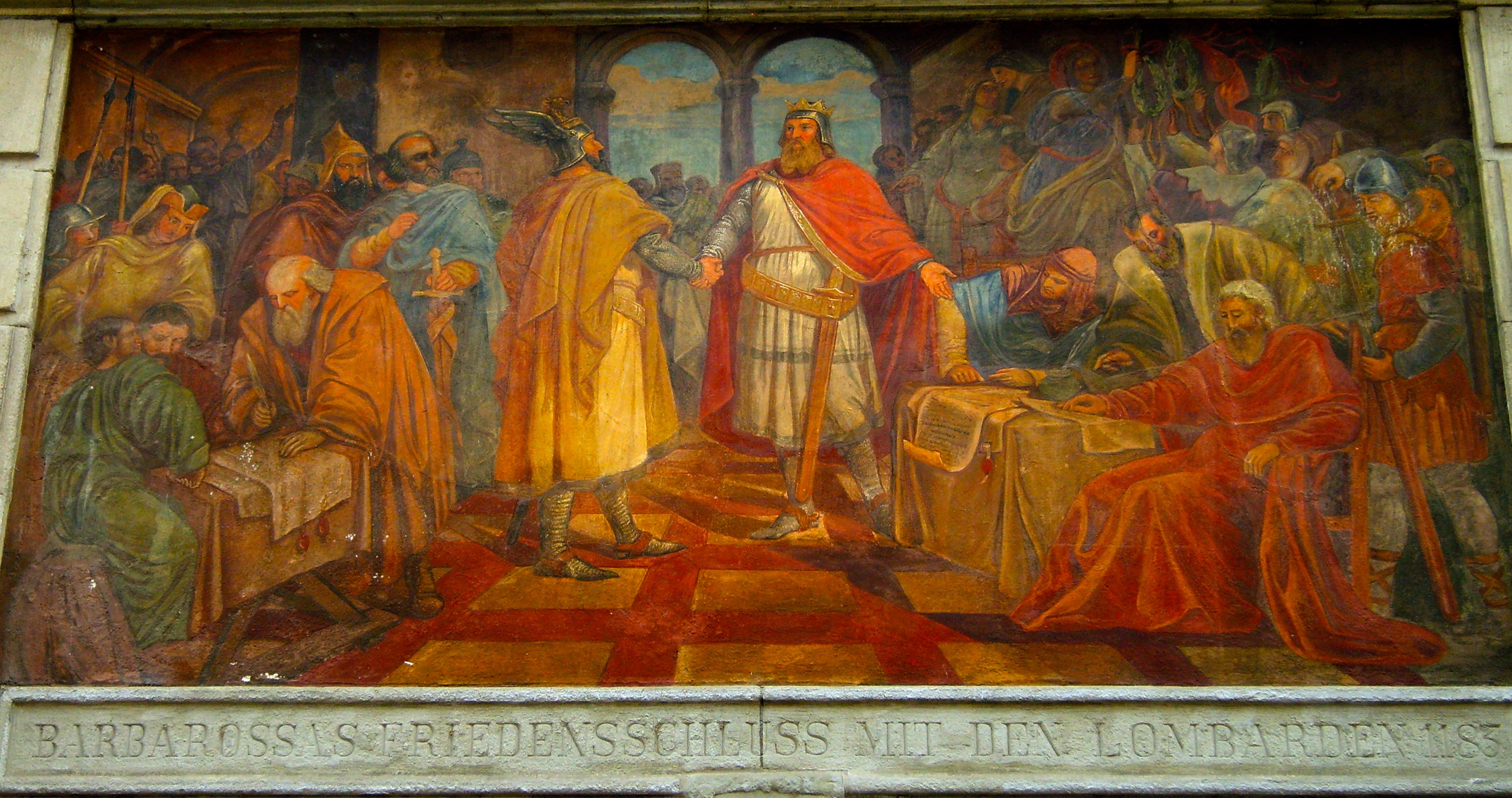 L’empereur Frédéric Ier Barberousse et la Ligue lombarde concluant la Paix de Constance (25 juin 1183) — Hôtel de ville de Constance, extrême-sud de l’actuel Bade-Wurtemberg en Allemagne