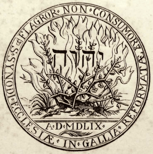 Flagror Non Consumor (« je brûle mais ne me consume pas », Exode 3:2) – Le buisson ardent fut l’emblème des Églises réformées de France dès 1559